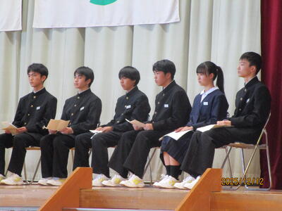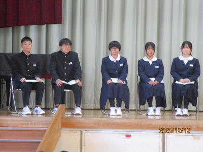 12月12日(金)6校時、令和8年度の生徒会役員を決める「生徒会立会演説会及び投票を行いました。これまでに朝の登校時や給食時の放送でも応援や演説を行ってきましたが、5名の副会長候補者と6名の会長候補者が自分の決意をしっかりと述べ、生徒たちも真剣にそれぞれの決意を聞いていました。その後、各学年に分かれて投票を行い、来週月曜日放課後、開票の予定です。